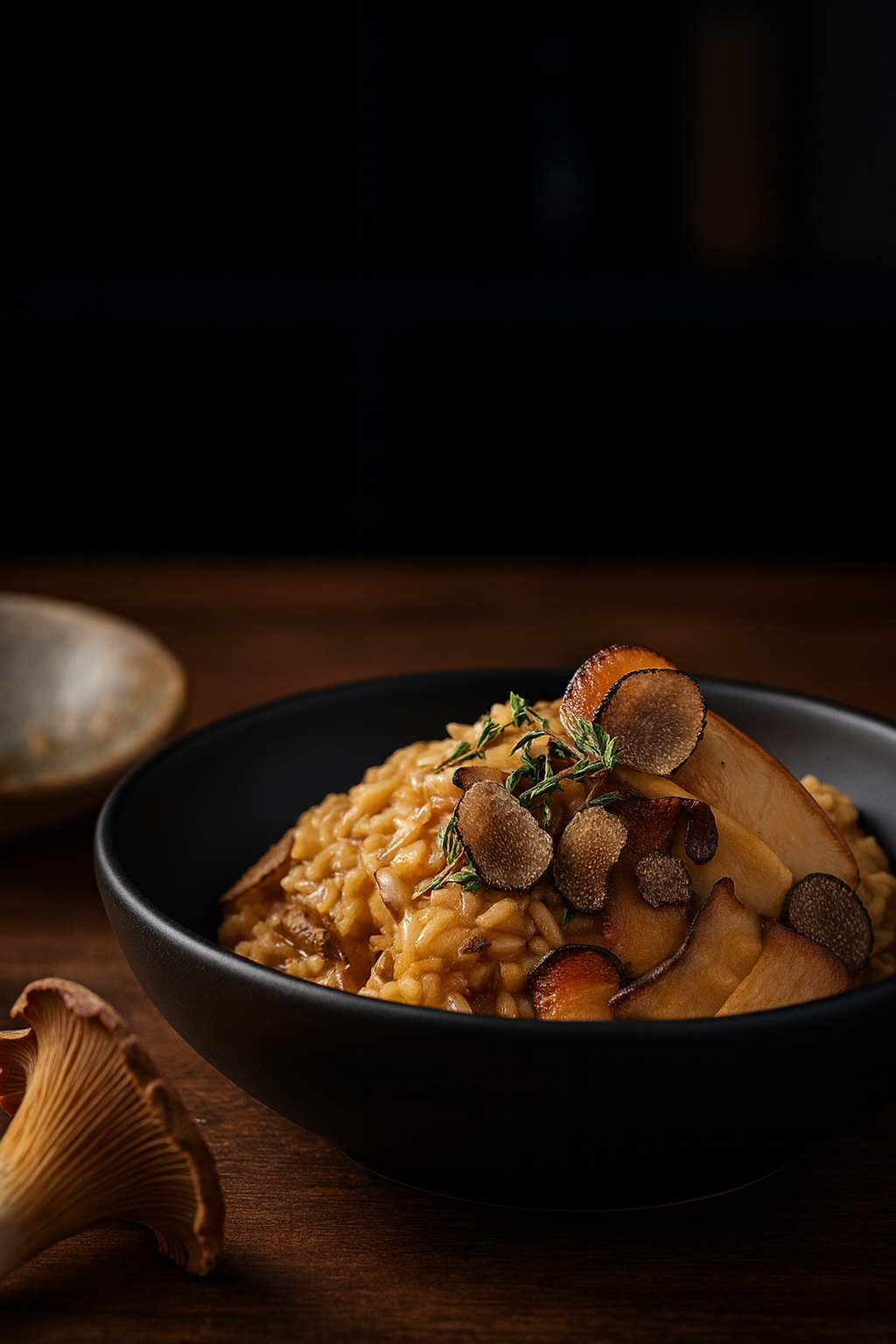 Ένα πολυτελές, κρεμώδες ριζότο με ρύζι Aquarello, κανθαρέλλες, σιτάκε, πεκορίνο και τελείωμα με φρέσκια μαύρη τρούφα. Εκλεπτυσμένο, αρωματικό και βαθιά ιταλικό.